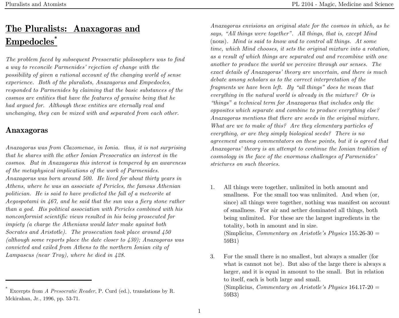 Pluralists [Anaxagoras And Empedocles] (Article)